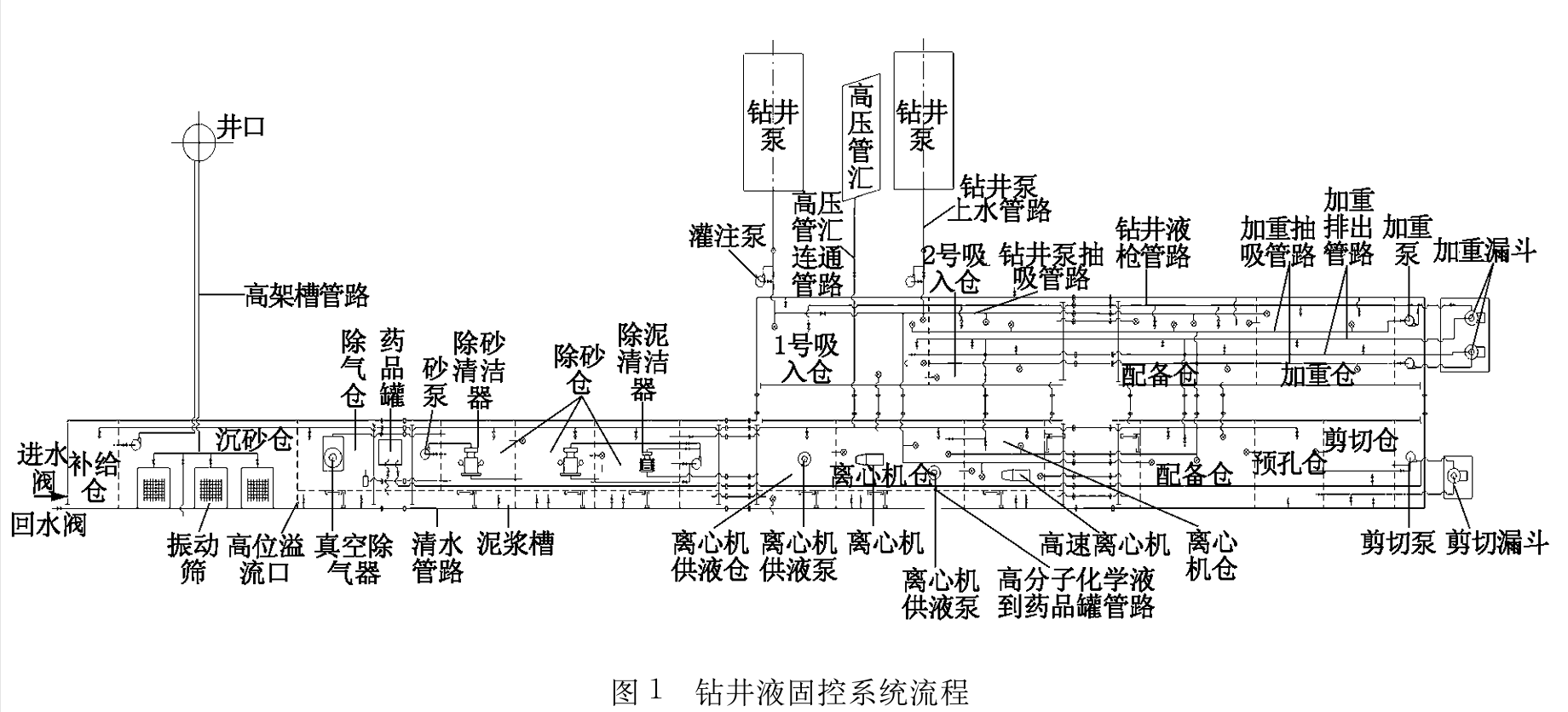 整套固控系统的工艺流程应满足钻井液的5级固相控制(筛分—除气—除砂—除泥—离心)及泥浆加重等要求。固控设备的优化配套非常重要固控设备1~5级的处理量应相互匹配,且分离粒度的间距适当,有一定的重叠,使上一级固控设备处理不完全的较小颗粒在下一级固控设备中仍可被处理。